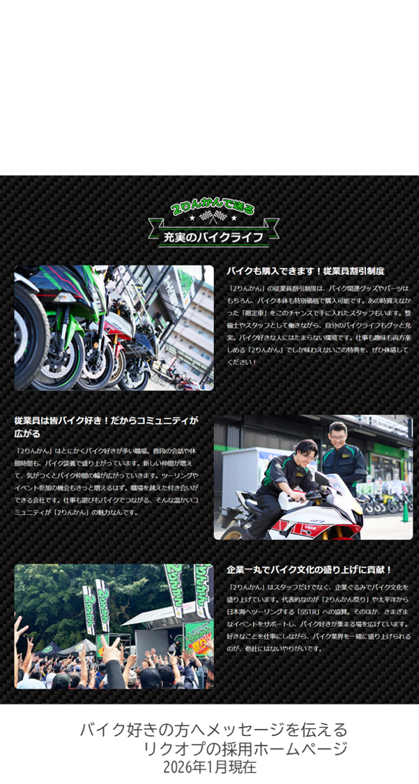 こちらが必要としている人材、「バイクが好き」な人にアピールできるリクオプは、弊社にとても合っていると思います。世間一般において、バイク好きは少数ですが、だからこそ、2りんかんで働く楽しさ、やりがいに共感していただいている、それをしっかり伝えることができるのがリクオプだと考えています。