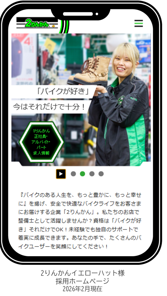自社採用ホームぺージで多くの情報・メッセージを求職者に伝えることができる。これが求職者とのマッチングに役立っています。バイク用品という専門的な商品を取り扱うため、単に家から近いから、勤務シフトが合うからの理由だけでは、採用は難しいのです。資格や経験・知識は無くても、バイクが好き。これが外せない条件です。